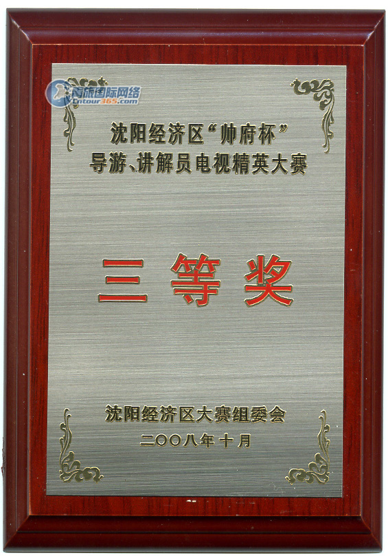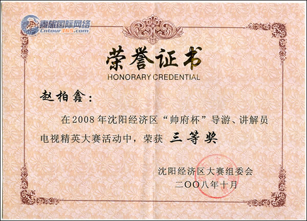 熱烈祝賀沈陽青旅趙柏鑫等在2008沈陽經(jīng)濟區(qū)“帥府杯”導(dǎo)游員電視精英大賽中取得優(yōu)異成績,并獲得“明星導(dǎo)游員”殊榮