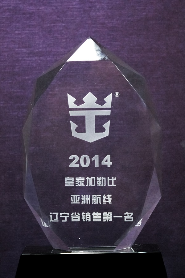 2015年1月14日 皇家加勒比國際游輪2014年度頌獎晚宴在上海舉行,晚宴上,舉行了“2014年皇家加勒比亞洲航線銷售前十名”頒獎典禮,我社獲得“皇家加勒比亞洲航線遼寧省銷售第一名”