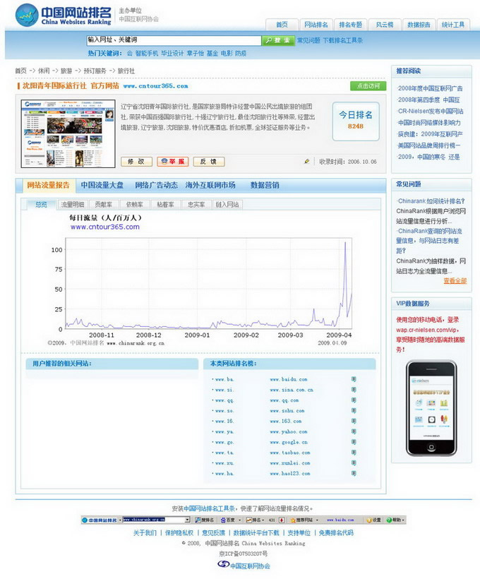 2009年4月9日,青旅國際網(wǎng)絡(luò)在中國互聯(lián)網(wǎng)協(xié)會全國網(wǎng)站排名躋身進(jìn)前10000名,青旅電子商務(wù)中心將繼續(xù)秉承一貫的嚴(yán)謹(jǐn)作風(fēng)和熱情態(tài)度為廣大旅游者提供更好的網(wǎng)絡(luò)服務(wù)。