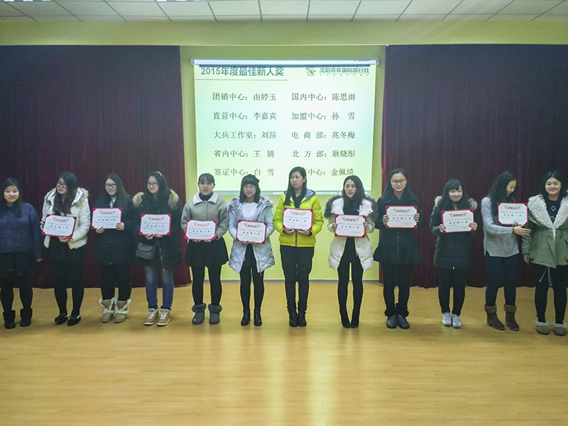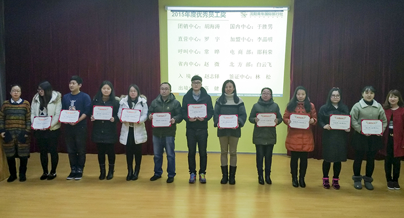 2016年2月23日下午,沈陽青年國際旅行社有限公司直客體系在和平區(qū)少年宮的階梯教室舉辦了2015年優(yōu)秀員工和部門的表彰大會。呼叫中心被評為2015年度最受歡迎的銷售部門,出境中心被評為2015年度最受歡迎的操作部門。北方部、出境中心、國內(nèi)中心、大兵工作室、電商供應(yīng)部、加盟中心獲得優(yōu)秀團隊獎。省內(nèi)中心和呼叫中心獲得公益項目突出貢獻(xiàn)獎。