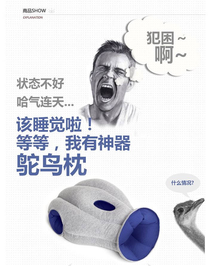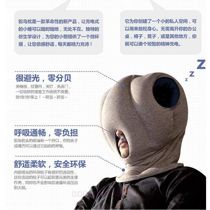 經(jīng)常外出坐硬座的朋友們都知道那是怎樣的一種煎熬,想睡又睡不好,不睡又挺不住,累啊,現(xiàn)在鴕鳥枕的發(fā)明讓您即使是坐著也一樣擁有好睡眠,火車,汽車,學(xué)生,上班族,只要是您人在旅途,鴕鳥枕頭都是您最好的選擇,為您隔絕噪雜混亂的環(huán)境,還您一個完美的睡眠!
